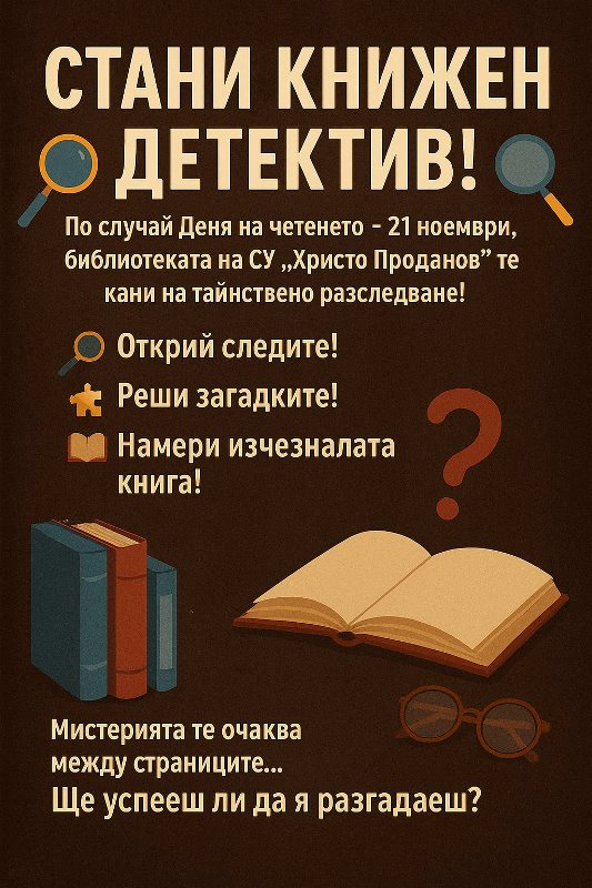 По случай Деня на четенето – 21 ноември, в библиотеката на СУ „Христо Проданов“ ще се превърне в място на мистерия, книги и приключения!