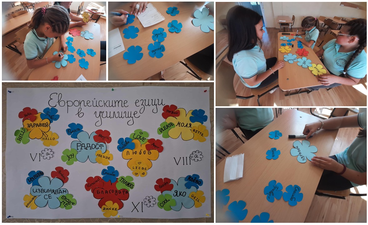 За да покажат, че могат да се изразяват свободно и на чужди езици, учениците от 6.а, 8.a и 11. б клас подготвиха креативен постер, включващ любими думи на български, английски, руски, немски и испански език- езиците, които се изучават в нашето училище. Така показаха, че езиковото многообразие е възможност за повече разбирателство и творчество.